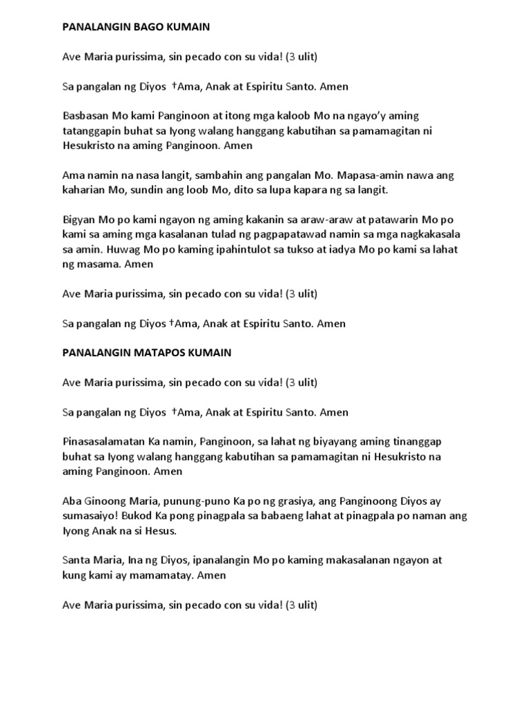 Tagalog prayer bago kumain. Ito ay mga halimbawa ng mga Tagalog na panalangin na maaaring usalin ng mahina o malakas bago kumain ng almusal tanghalian o hapunan. Ugaliing umusal ng kahit isang maikling dasal bago kumain before meals upang makapagpasalamat sa dakilang Panginoon. Maraming salamat Panginoon sa patuloy ninyong pagbibigay sa amin ng mga pagkaing aming kailangan upang.